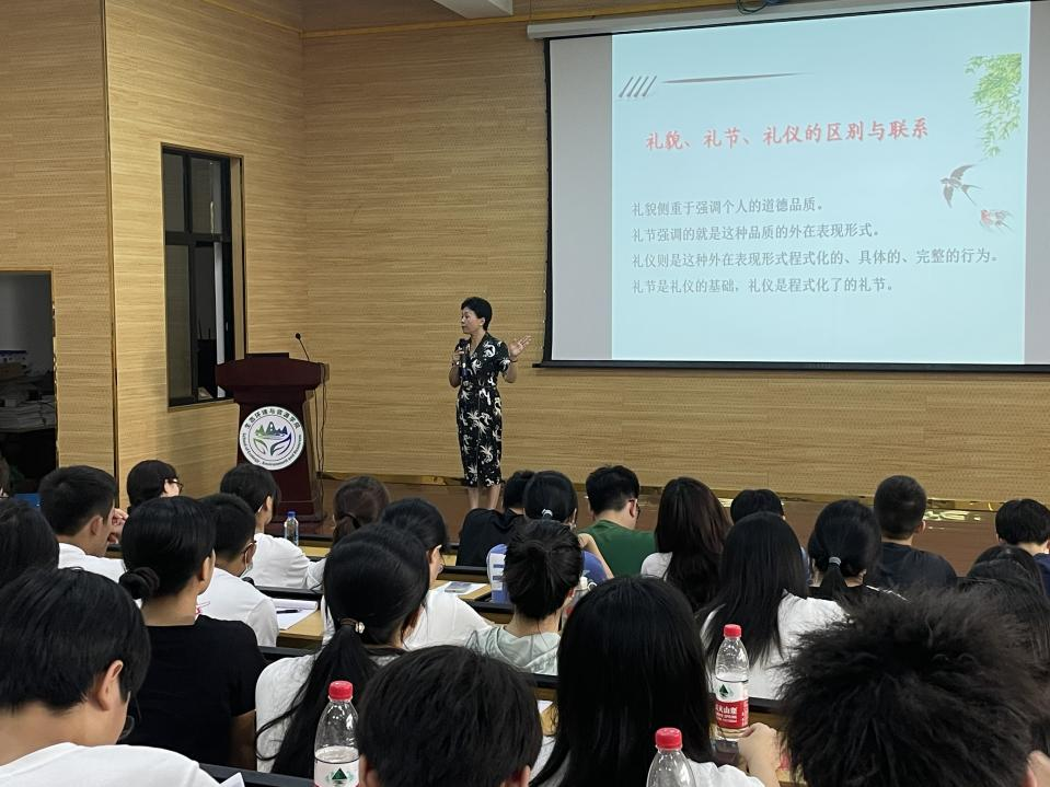 在科技南楼一楼报告厅举行大学生社交礼仪专题培训,邀请了学校通识教育中心张少慧副教授为同学们授课。学院党委副书记武慧娟、辅导员章莹、2022级全体新生和2021级本科生参加了本次培训。