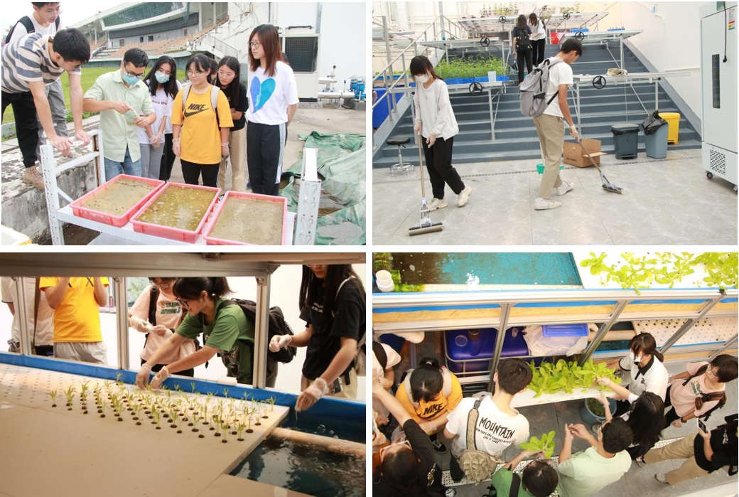 生态理论知识与劳动实践教育的结合是新工科人才培养的重要内容,学生在温室大棚学习“鱼菜共生”新型复合耕作体系的原理,同时以劳动实践的形式来增强劳动意识。在劳动实践过程中,学生在专业指导下学习科技劳动种植培育的方法。学生们分为若干个小组,分别负责播种、转移生长期菜苗至泡沫种植板上进行水培培养、采收种植板槽中已经成熟的作物,最后打扫大棚卫生、清洁种植板和种植槽,为后续的种植提供良好环境。活动后,本科生何邦润同学表示,“我在此次科技劳动实践中近距离接触了双创科研项目,拓宽了专业视野,其二是学习了育苗、挖菜、清扫等基础农务知识,是理论到实践、再到科学技术学习的新体验。”