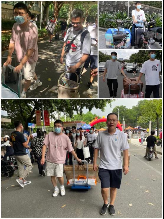 学校周围水泄不通,“教授迎新团”立刻出动,顶着骄阳,来到校外帮助新生搬运行李,他们不辞辛劳从校外公路一路穿行,一直走进宿舍,在校园宿舍区众多新面孔中,形成一道独特的风景。