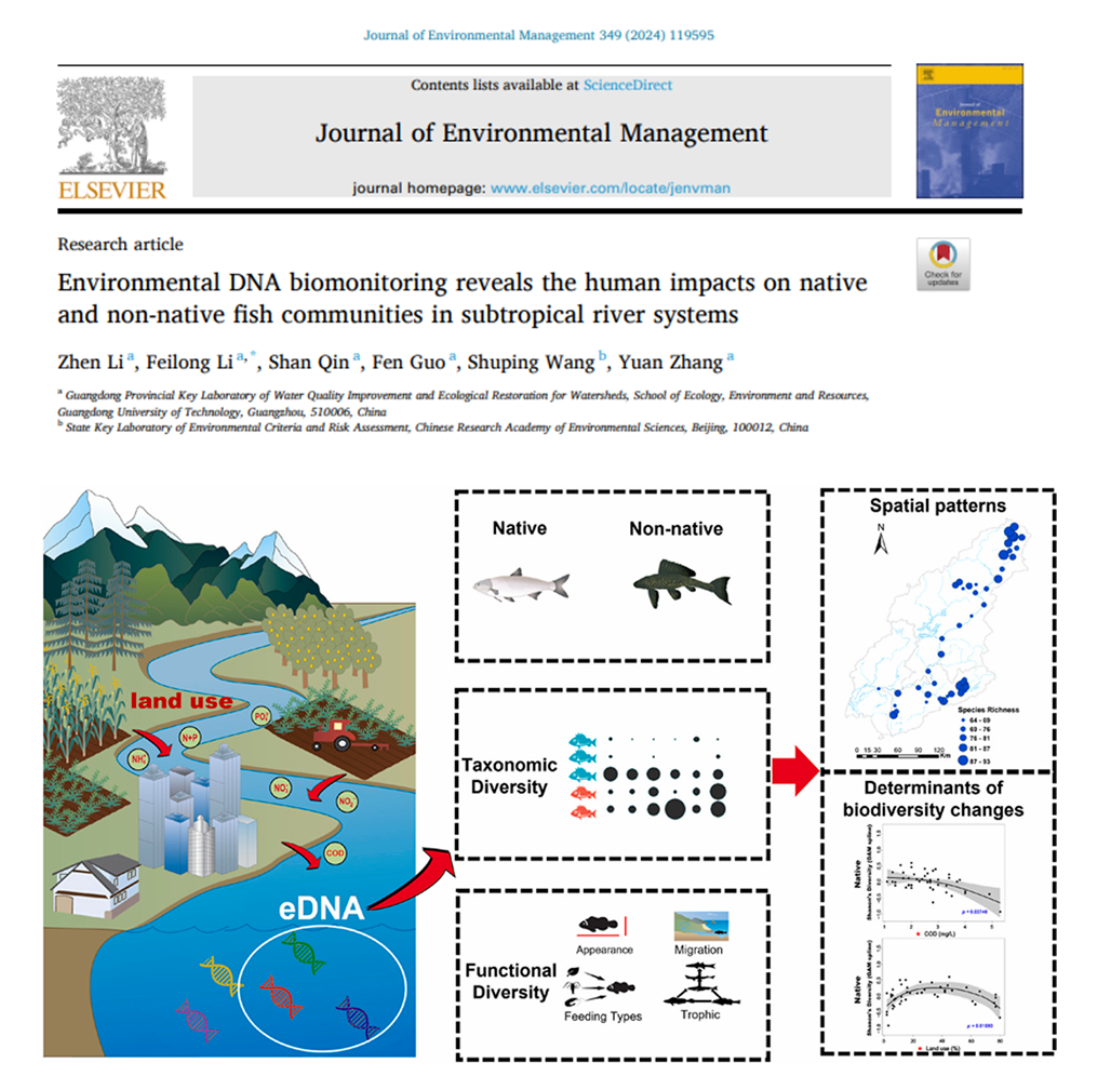 (4) Li, Z., Li, F*., Qin, S., Guo, F., Wang, S., & Zhang, Y. (2024) Environmental DNA biomonitoring reveals the human impacts on native and non-native fish communities in subtropical river systems. Journal of Environmental Management, 349, 119595.