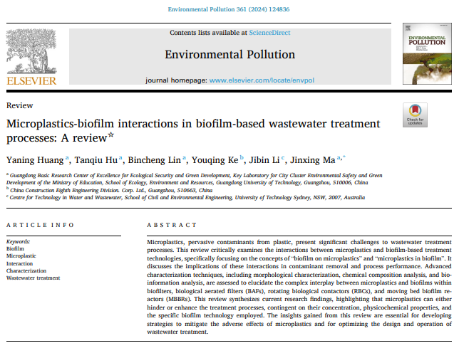 马金星教授课题组在 Environmental Pollution发表最新成果:Microplastics-biofilm interactions in biofilm-based wastewater treatment processes: A review,第一作者为a漫