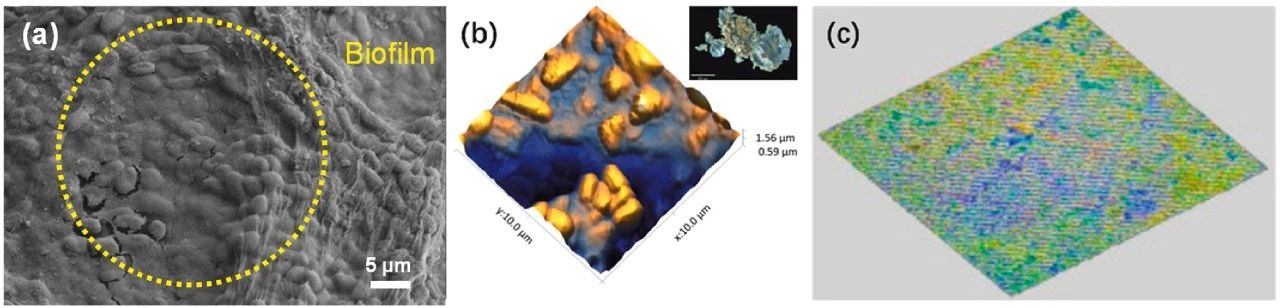 图2使用SEM、AFM和CLSM等表征技术对微塑料和生物膜进行表征。(a)微塑料上形成的生物膜的SEM图像;(b)菌株ATKU1在微塑料上形成生物膜的AFM高分辨图像;(c)微塑料上生物膜的CLSM图像