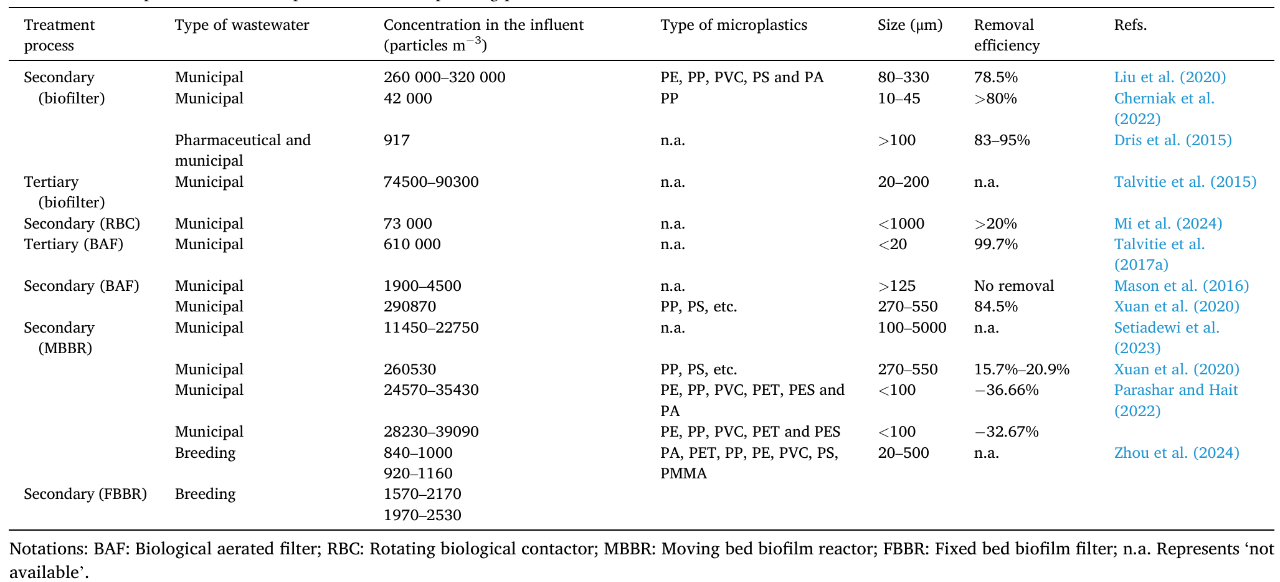 综述了废水处理工艺(生物过滤器、BAF、RBC和MBBR)中微塑料和生物膜之间的关系;