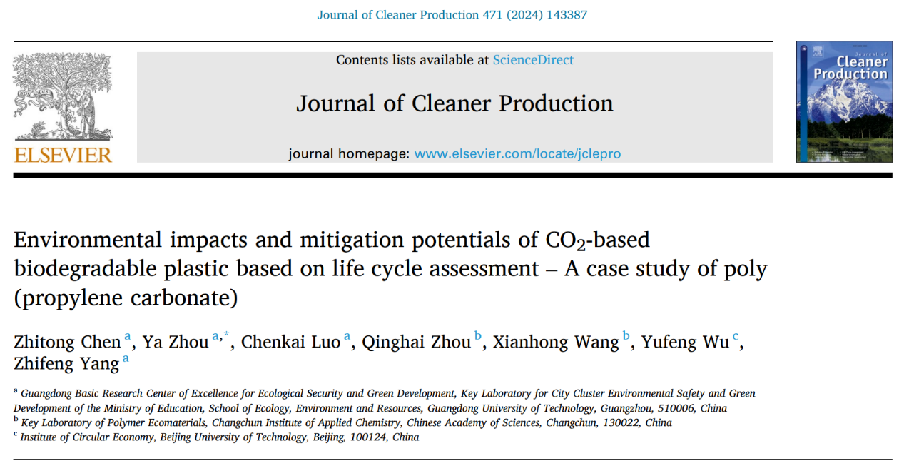 论文速递 | a漫 周雅教授课题组研究成果:CO2基生物降解塑料环境影响及减排潜力——以聚碳酸亚丙酯为例