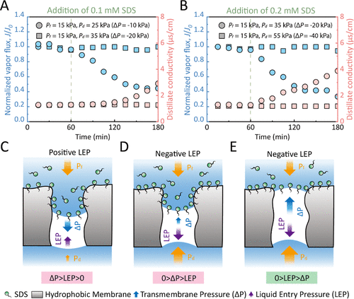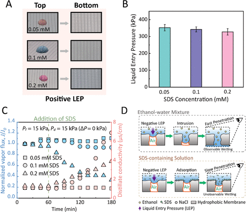 在本研究中,我们提出了PDMD的抗润湿操作策略。为了保障PDMD的运行,我们开发了一种基于阻抗的LEP测试方法,可以测量膜与各种溶液的LEP。基于阻抗的LEP测试方法优于传统方法,在于它能捕捉到缓慢润湿过程中膜孔内空气含量的微观变化。根据准确的LEP值,我们通过PDMD调控ΔP低于膜与进料溶液的LEP时,可以成功避免各种润湿剂(如SDS 和乙醇)引起的膜润湿。