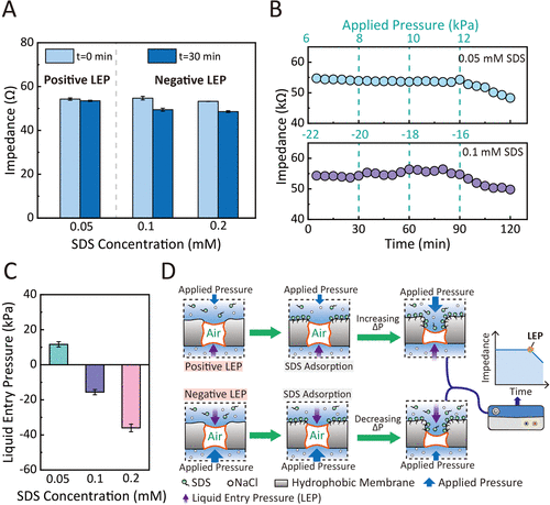 SDS溶液基于阻抗的LEP测试结果与传统方法截然不同,可以发现在低浓度时,SDS溶液的LEP呈正向;提高浓度时,SDS溶液的LEP呈负向,与无跨膜压力的膜蒸馏实验结果一致。借助阻抗测试的结果,我们能够持续监测膜孔中空气含量的微妙变化。当 LEP 为正压时,SDS溶液无法渗入膜孔,膜孔内的空气含量保持稳定,因此膜阻抗不变。相反,在负压下,SDS溶液会自发进入膜孔,导致膜内空气含量减少,阻抗下降。因此,在测量LEP值时,SDS溶液渗透到膜中引起的空气含量的缓慢变化也可以通过阻抗法检测到。因此,基于阻抗的方法可以精确测量SDS溶液的疏水膜的LEP。