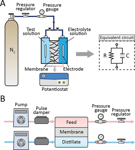 图1.(A)基于阻抗的LEP测试装置示意图;(B)加压膜蒸馏(PDMD)装置示意图。