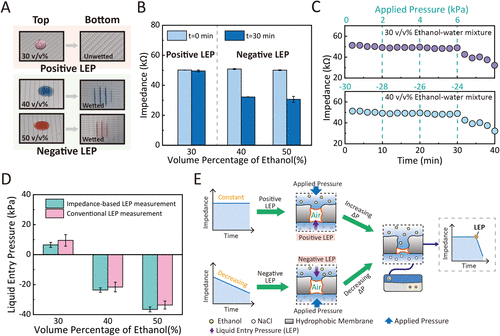 为了验证基于阻抗的LEP测量方法的可行性,我们把该方法与传统LEP测量方法进行对比。如图二,我们发现传统方法和基于阻抗的方法测量出来的LEP数值是基本一致的,这验证了基于阻抗的LEP测量方法是有效的。其工作原理如图2E 所示,在LEP值为正向的情况下,利用氮气在反方向施加压力。当施加的压力超过LEP时,乙醇溶液穿透膜孔,降低空气含量,从而降低膜阻抗。同样在LEP值为负向的情况下,借助氮气在反方向施加压力,可以防止乙醇溶液渗透到膜孔中。一旦施加的压力低于 LEP 的绝对值(即LEP低于施加的压力) ,乙醇溶液就会进入膜孔,由于空气含量降低导致膜阻抗下降。因此,通过监测膜阻抗在不同外加压力下的变化,基于阻抗的LEP测量方法可以准确测量低表面张力液体膜的 LEP值。