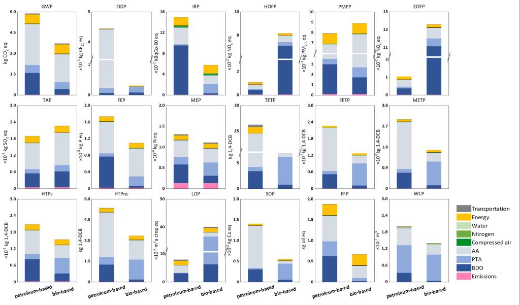 随着塑料需求持续攀升,塑料污染日益严峻。作为传统塑料绿色替代品,生物降解塑料环境影响备受关注。作为生物降解塑料的主导品种,聚对苯二甲酸-己二酸丁二酯(PBAT)已应用于包装和农业领域。PBAT及其第二代生物基原料的环境表现尚未受到关注。本研究编制中国PBAT“摇篮到大门”生命周期清单,开展生命周期评价,探究相较石油基PBAT及传统塑料,以第二代生物基原料的PBAT环境表现及潜力优势。结果显示,在18个环境影响指标中,石油基PBAT的原料贡献率超过70%。相比之下,采用第二代生物基原料生产PBAT在16个环境影响指标上实现15-85%的降低,若PBAT生产开展可再生能源替代能进一步减少10%环境影响。生物基PBAT在16个环境影响指标中表现优于传统塑料(PVC、PP、HDPE、LDPE 和 PET),其环境影响比传统塑料低15-80%。生物基 PBAT全球变暖潜能值GWP为3.72kg CO2eq,比传统塑料低18-32%。鉴于上游原料合成在PBAT生命周期环境影响中的主导地位,研发生物合成技术可以显著降低生物降解塑料环境影响,提高塑料行业可持续性。研究结果为生物基生物降解塑料的环境影响及其缓解策略提供科学依据,为PBAT行业可持续发展提供建议。