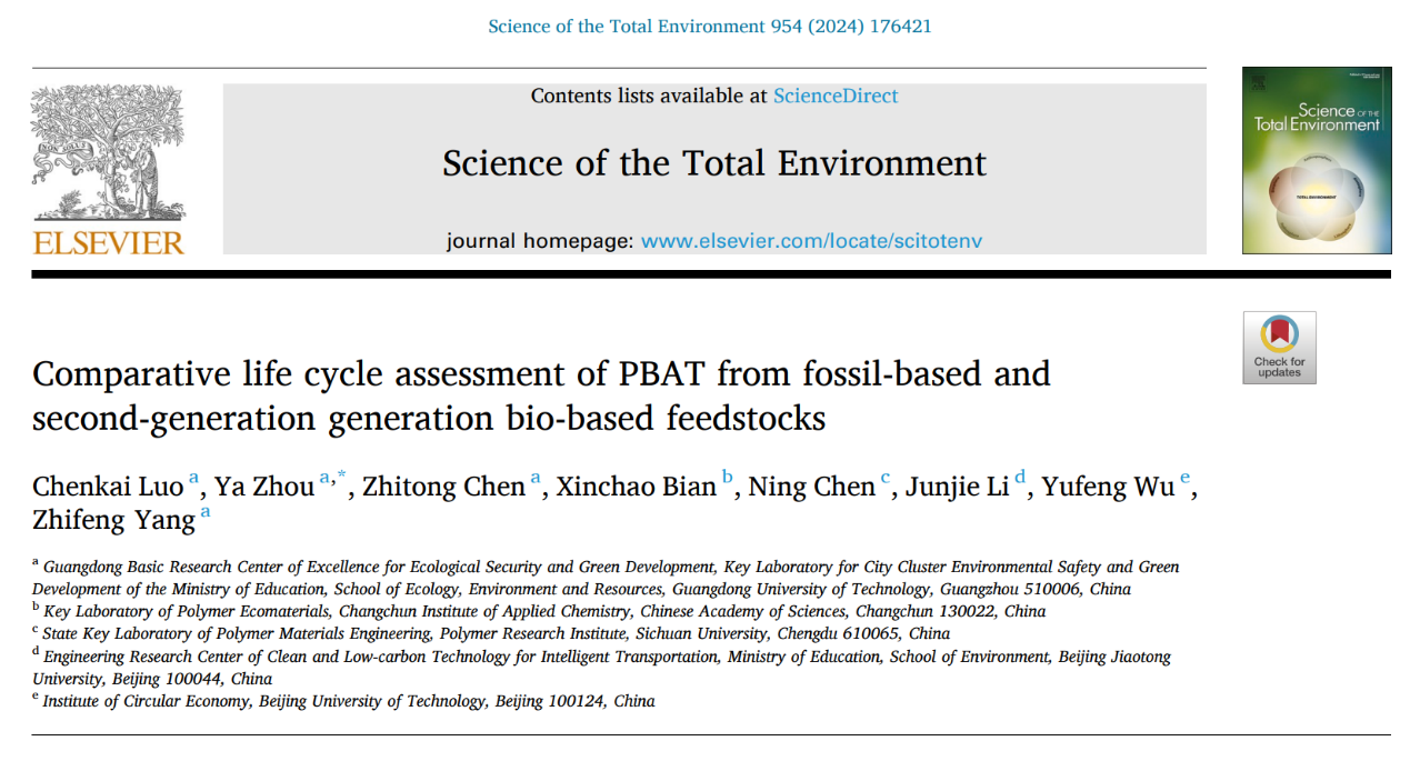 a漫 杨志峰院士团队周雅教授课题组在Science of The Total Environment期刊发表题为“Comparative life cycle assessment of PBAT from fossil-based and second-generation bio-based feedstocks”的研究论文。第一作者为22级硕士研究生罗宸垲,通讯作者为周雅教授,合作单位包括中国科学院长春应用化学研究所、四川大学、北京交通大学、北京工业大学。