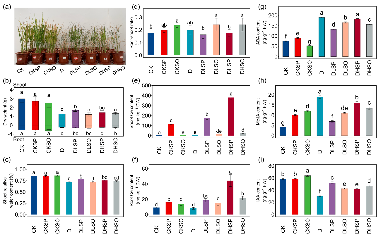 图1. CeO2NPs和干旱对水稻生长和植物生理的影响。(a)水稻幼苗表型。(b)水稻地上部和根部干重。(c)水稻地上部相对含水量。(d)水稻根冠比。水稻地上部(e)和根部(f)中的铈含量。水稻叶片中脱落酸(g)、茉莉酸甲酯(h)、生长素(i)的含量。