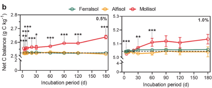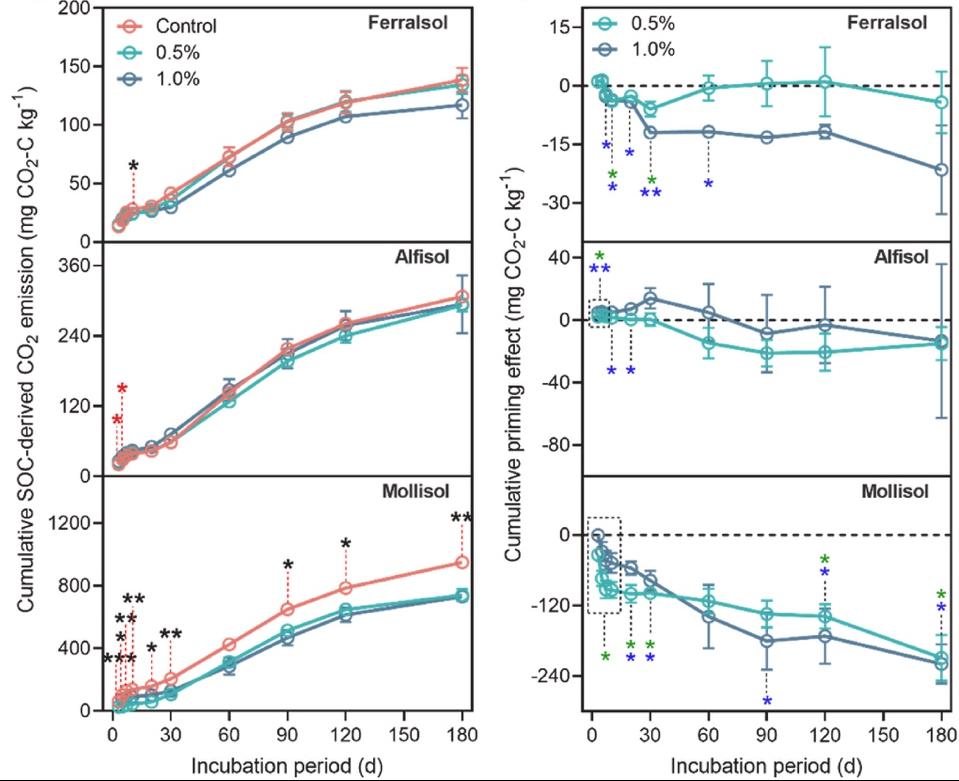 图1PLA-MPs输入后三种土壤的SOC源CO2的累积排放量(左图)和累积激发效应(右图)。0.5%和1.0%指的是PLA-MPs的添加量为0.5%(w/w)和1.0%(w/w)。