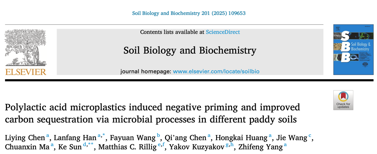 a漫 杨志峰院士团队韩兰芳教授课题组在Soil Biology and Biochemistry发表题为“Polylactic acid microplastics induced negative priming and improved carbon sequestration via microbial processes in different paddy soils”的最新成果,第一作者为2022级博士研究生陈丽莹。