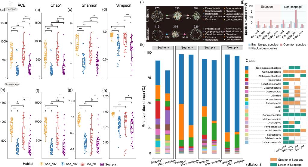 图1.(a)-(d)渗漏区微生物alpha多样性;(e)-(h)非渗漏区微生物alpha多样性;(i)展示渗漏区海水、沉积物和塑料际中门级别的独有和共有物种的二分关联网络图;(j)展示在不同的栖息环境中门级别独有和共有物种的数量丰度的柱状图;(k)在纲级别物种相对丰度前20的物种组成柱状图,如果渗漏区纲级别的物种丰度显著高于非渗漏区,橙色表示,如果低于,则用绿色表示。用env和pla区分环境和塑料际的微生物群落,用sed和sea区分沉积物和海水。