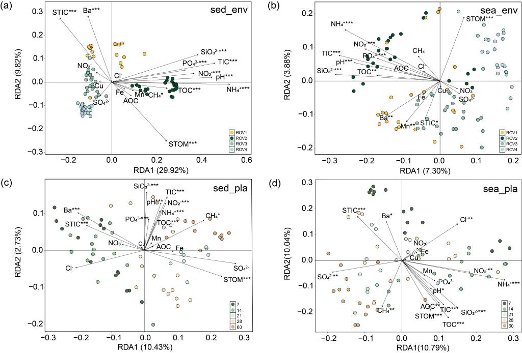 塑料的大量生产和广泛使用导致了海洋微塑料污染日益严重。深海冷泉生态系统富含源自海底渗漏的碳氢化合物流体,在碳循环和氮循环相关的微生物的作用下维持生态系统稳定。目前冷泉生态系统的微塑料污染鲜有研究。为了填补这一知识空白,我们收集了海马冷泉区的沉积物和海水样品,模拟深海冷泉环境,进行为期两个月的实验室培养实验。主要结论是:(1)当微塑料被添加到沉积物和海水介质中,微生物群落主要受原始环境的影响;塑料际群落与培养时间有关。(2)与环境介质中的微生物群落相比,塑料际的共现网络结构更脆弱。(3)多种环境因子决定了微生物群落组成,然而由少量的环境变量驱动微生物群落功能。