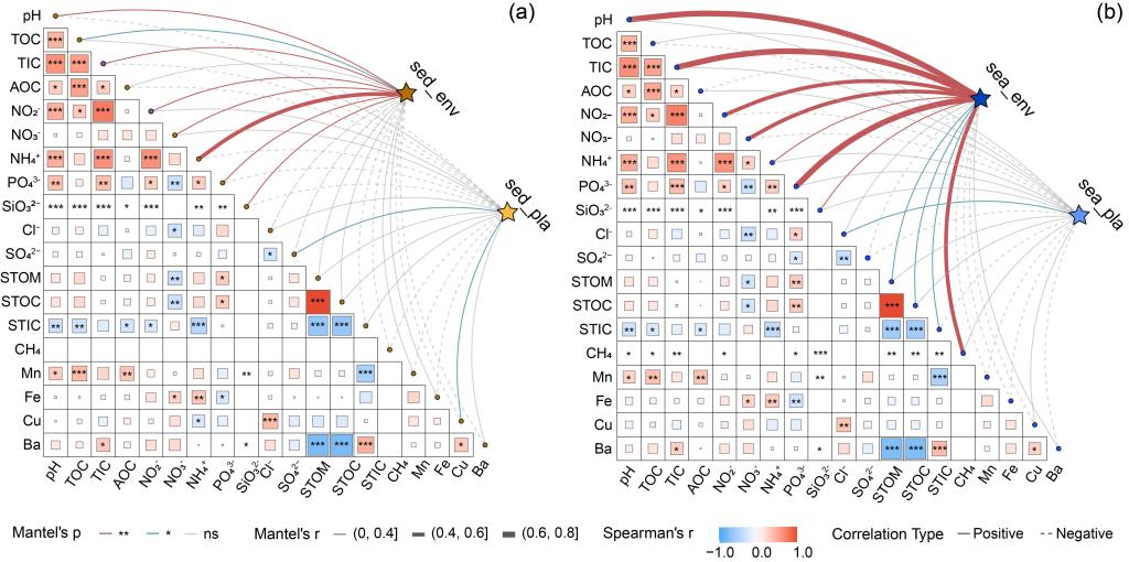 图4.基于PICRUSt2预测的群落功能与环境参数的Mantel test分析。(a)沉积物;(b)海水。