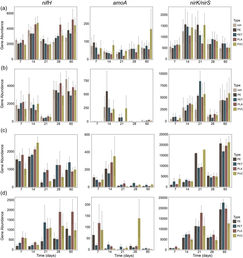 图5.添加不同塑料在沉积物(a)、海水(b)、塑料际(c)中,氮固定、硝化、反硝化基因丰度差异柱状图。