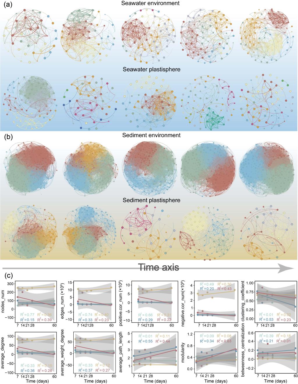 图3.(a)海水环境和塑料际的共现网络随时间的演替;(b)沉积物环境和塑料际的共现网络随时间的演替;(c)环境和塑料际微生物共现网络的拓扑参数。不同颜色表示不同的栖息环境,分别有黄色(沉积物)、红色(沉积物塑料际)、绿色(海水)、蓝色(海水塑料际)。
