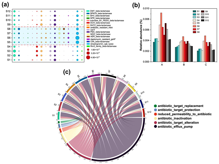 图5:抗性基因的演化。(a)不同类别和(b)外排泵基因的相对丰度;(c)基于综合抗生素抗性数据库(CARD)的不同时期抗性机制弦图。注:S1-S12与图3中描述的一致;在图b中,A:抗性结瘤细胞分裂(RND)抗生素外排泵,B:ATP结合盒(ABC)抗生素外排泵,C:主要促进剂超家族(MFS)抗生素外排泵。