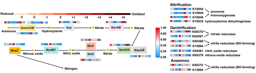 图4:使用宏基因组分析对MABR系统氮代谢途径在OTC应激下的KEGG直系同源性(KO)。垂直比例尺表示KEGG KO注释的标准化丰度。注:条形图(0.00–1.00)表示KEGG相关数字的相对丰度。蓝色色调表示相对丰度较低,而红色色调表示相对丰度较高。