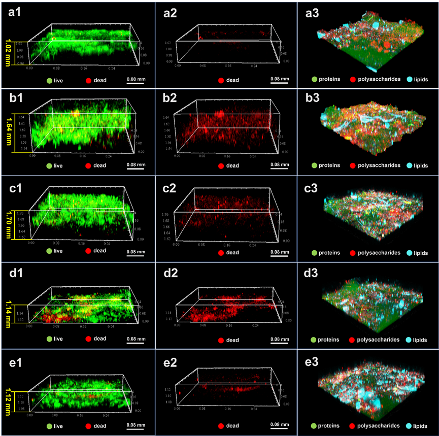 图2:MABR运行过程中生物膜生长与组分动态可视化。(a1-a3)成熟生物膜,(b1-b3)OTC暴露15天,(c1-c3)OTC暴露35天,(d1-d3)修复期及(e1-e3)气压调节后的生物膜活/死细胞活性染色及蛋白质、多糖、脂质分布。注:活/死细胞染色:a1-e1示活细胞(绿色荧光),a2-e2示死细胞(红色荧光)。组分染色:a3-e3中蛋白质、多糖、脂质分别以绿色、红色、靛蓝显色。