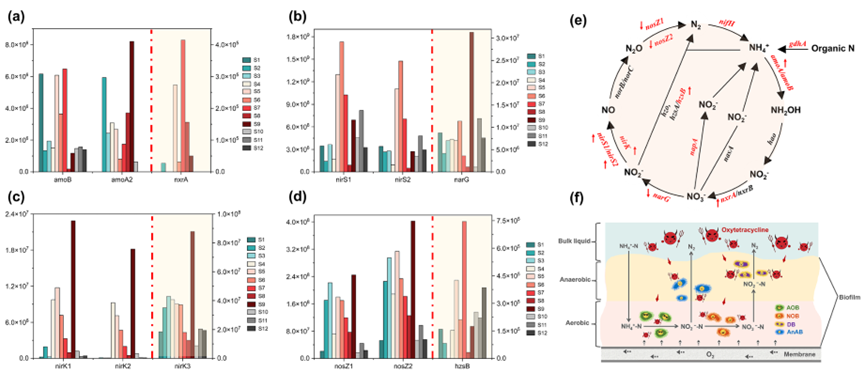 图3:基于高通量qPCR基因芯片测序的微生物群落中元素氮循环基因的演化。负责(a)氨和亚硝酸盐氮氧化,(b)硝酸盐氮和亚硝酸盐氮还原,(c)亚硝酸盐氮转化为一氧化氮,(d)反硝化过程中一氧化二氮转化的功能基因;(e)上调和下调N循环途径的示意图;(f)高OTC胁迫对MABR中N循环影响。注:S1:接种污泥;S2:成熟生物膜(阶段I);S3:阶段II内层生物膜;S4:阶段II外层生物膜;S5:OTC暴露15天(阶段III)内层;S6:OTC暴露15天外层;S7:OTC暴露35天(阶段III)内层;S8:OTC暴露35天外层;S9:修复期(阶段IV)内层;S10:修复期外层;S11:气压调节后(阶段V)内层;S12:气压调节后外层。在图e中,所有样品中注释的基因用红色表示,而未成功注释的基因用黑色表示;在图f中,AOB:氨氧化细菌,NOB:亚硝酸盐氧化细菌,DB:反硝化细菌,AnAB:厌氧氨氧化细菌。