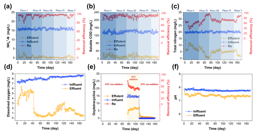 图1:MABR系统170天运行性能。(a)氨氮、(b)COD及(c)总氮浓度与去除率;(d)溶解氧(DO)、(e)土霉素浓度与去除效率及(f)进/出水pH值。注:进/出水浓度对应左轴,去除率(Re)对应右轴。