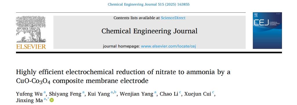 马金星教授课题组在环境领域知名学术期刊Chemical Engineering Journal上发表了题为“Highly efficient electrochemical reduction of nitrate to ammonia by a CuO-Co3O4 composite membrane electrode”的研究论文。