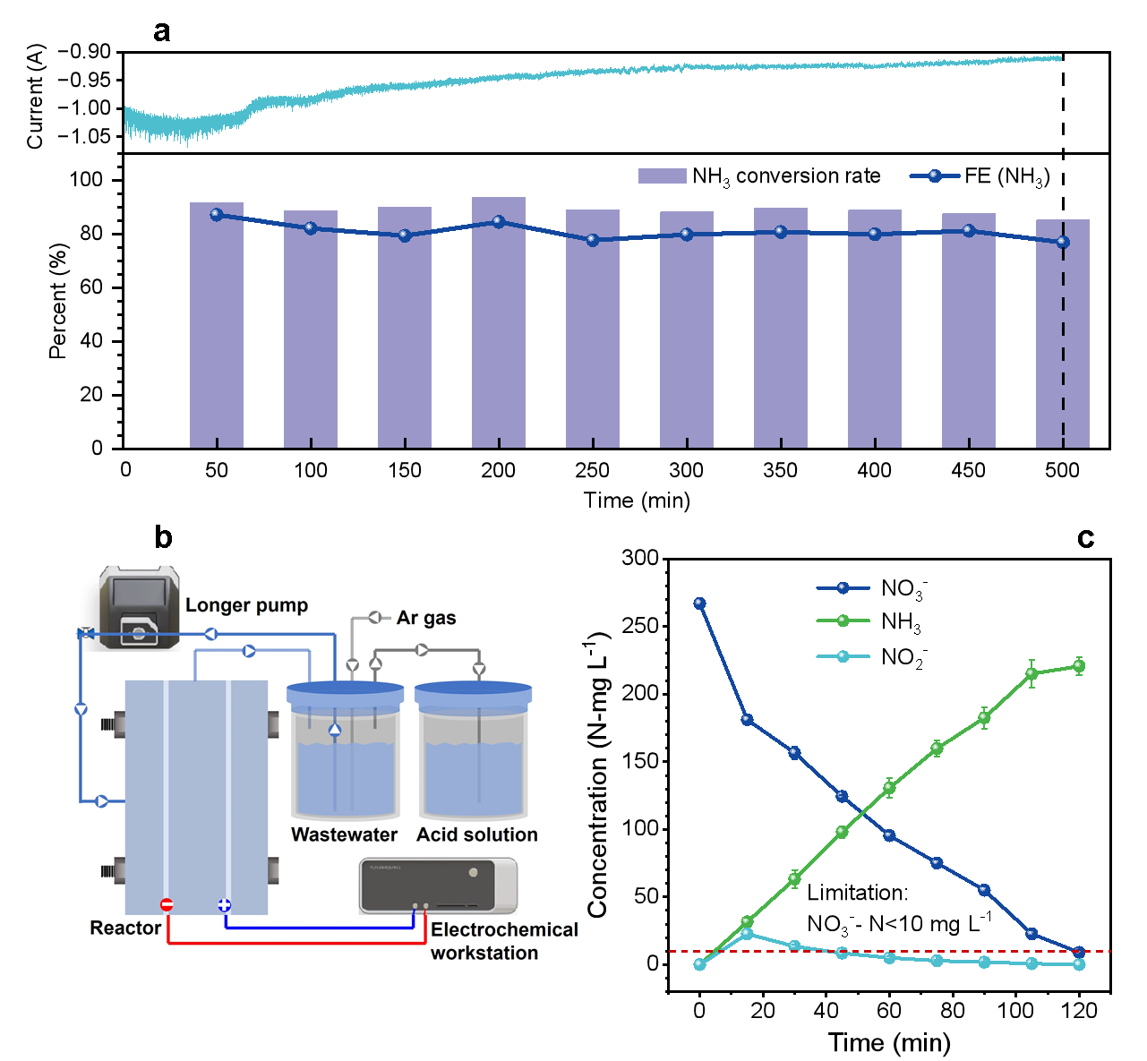 图5:(a)CuO-Co3O4膜电极在高浓度模拟硝酸盐废水中长时间运行的电流变化、氨气转化率和产氨法拉第效率;(b)对实际废水处理过程中的产物分布