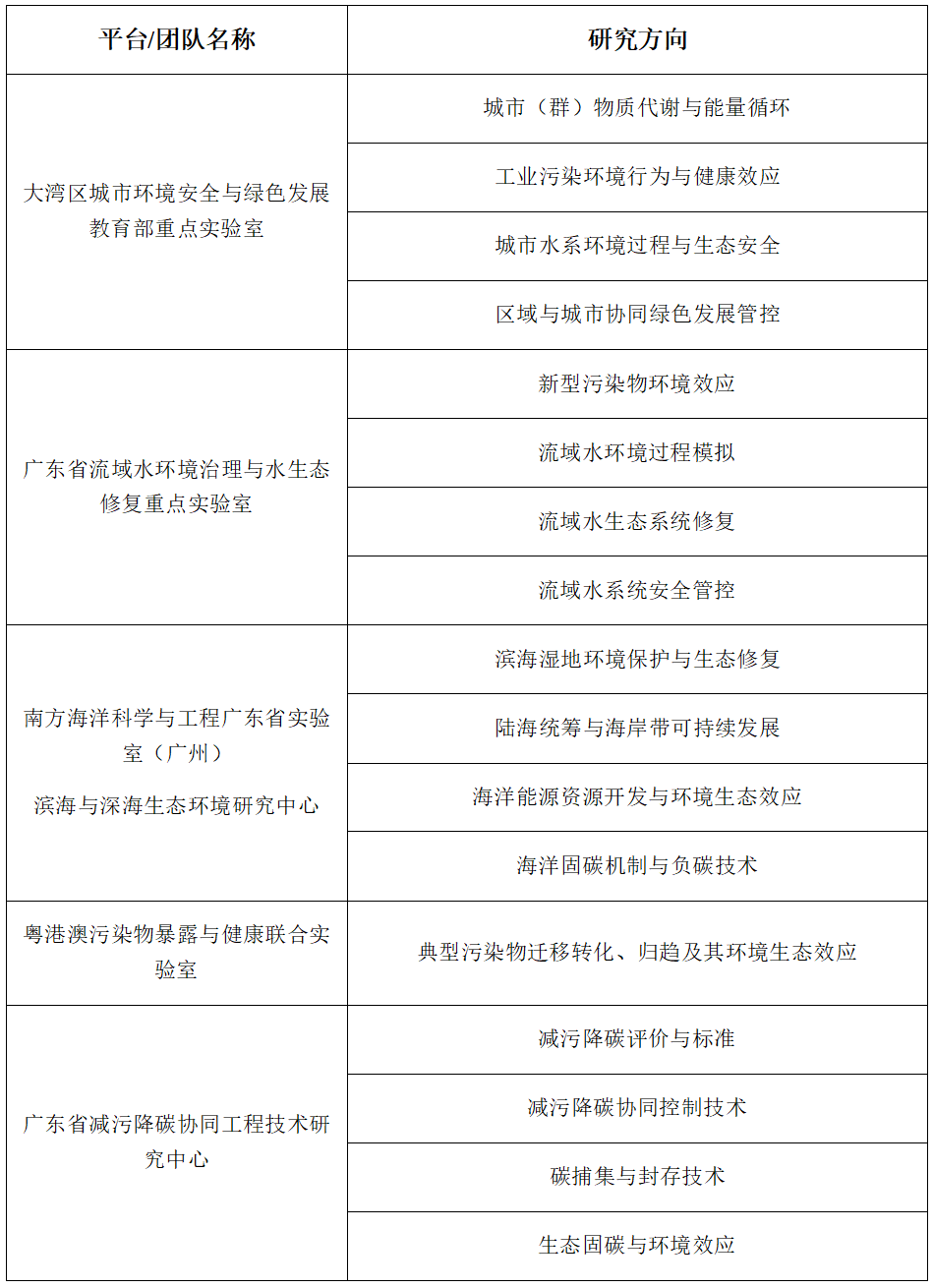 研究院已建有大湾区城市环境安全与绿色发展教育部重点实验室、广东省流域水环境治理与水生态修复重点实验室、粤港澳污染物暴露与健康联合实验室及南方海洋科学与工程广东省实验室(广州)重大专项创新团队。围绕上述省部级科研平台与团队,形成了如下特色鲜明的研究方向: