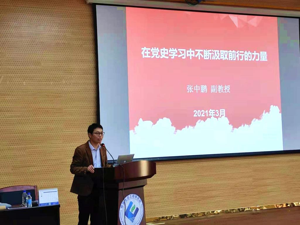 张中鹏副教授以“在党史学习不断汲取前进的力量”为题,以党的百年光辉历程为主线,围绕“五四运动的发展史”、“马克思主义学说在中国的传播”、“中共一大的召开”三个主题,为师生们生动讲述了我党的历史故事,解读共产党人浴血荣光、劈波斩浪、苦难辉煌的奋斗历程。