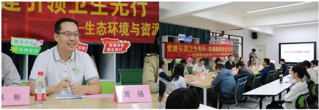 教职工第一党支部和本科生党支部在大学城校区易班发展中心会议室联合开展“党建引领卫生先行,共建健康安全校园”主题党日师生共建活动。学院党委副书记武慧娟、学院副院长、教职工第一党支部书记马金星、教职工第一党支部成员、本科生党支部成员及 2025 级本科新生参加。活动由教职工第一党支部副书记周扬主持。