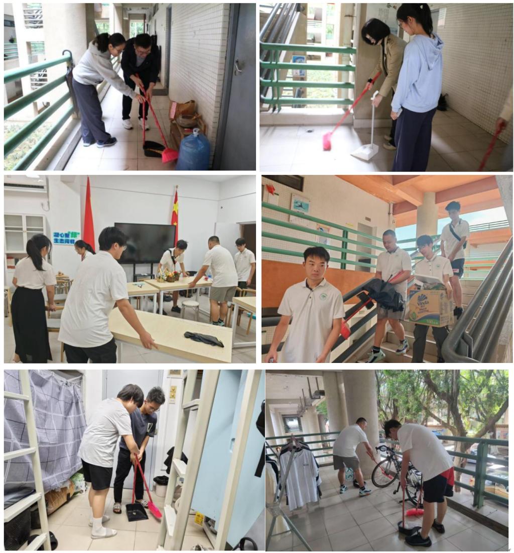 在实践环节,全体师生前往学生宿舍楼宇集中开展校园环境整治行动。师生们携带扫帚、抹布、垃圾夹等清洁工具,对楼道墙面和学生宿舍进行深度清洁,清积水、灭蚊虫,打造“安全、整洁、文明”的宿舍氛围。