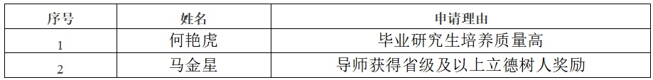 按照学校《关于评选2023年度优秀研究生导师的通知》,经个人申请,学院党组织审核及学位评议组评选,决定推荐何艳虎老师、马金星老师为优秀研究生导师,现予以公示。如有意见,请实名反馈,并提供相关理由。